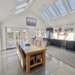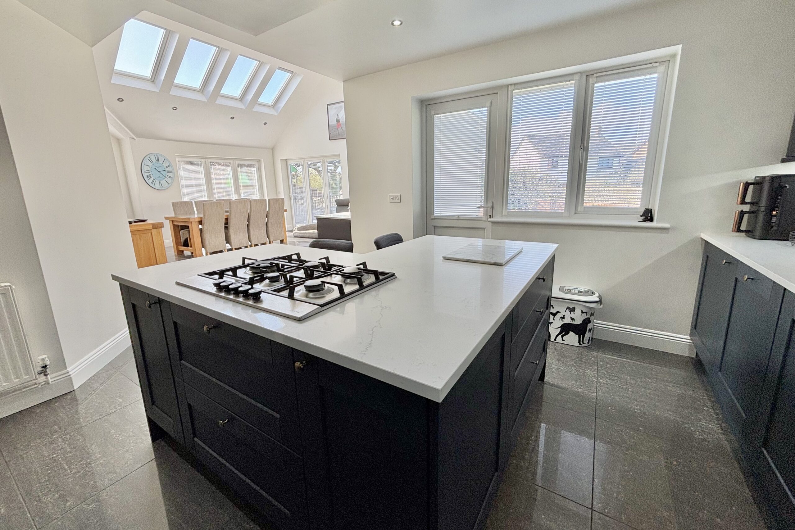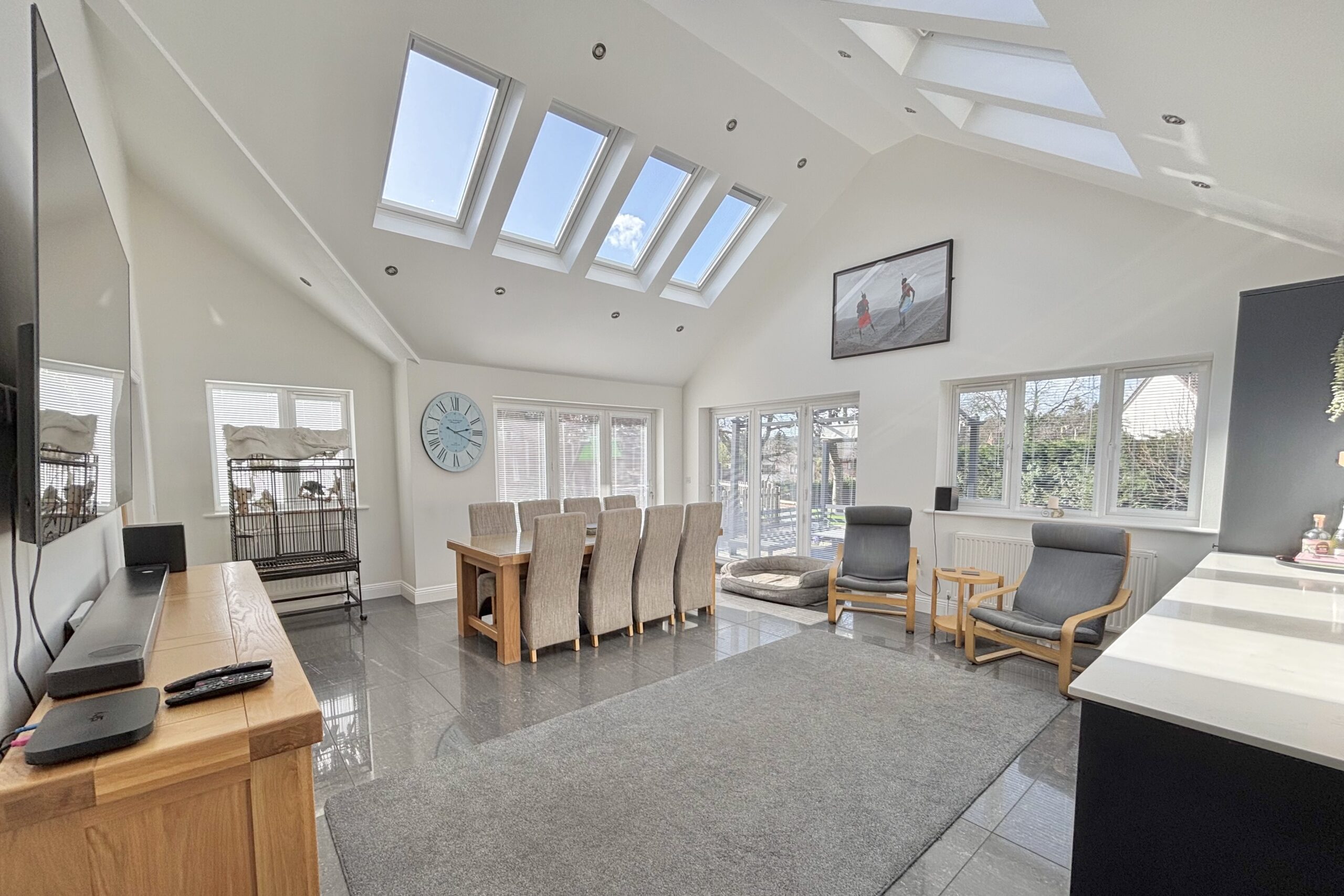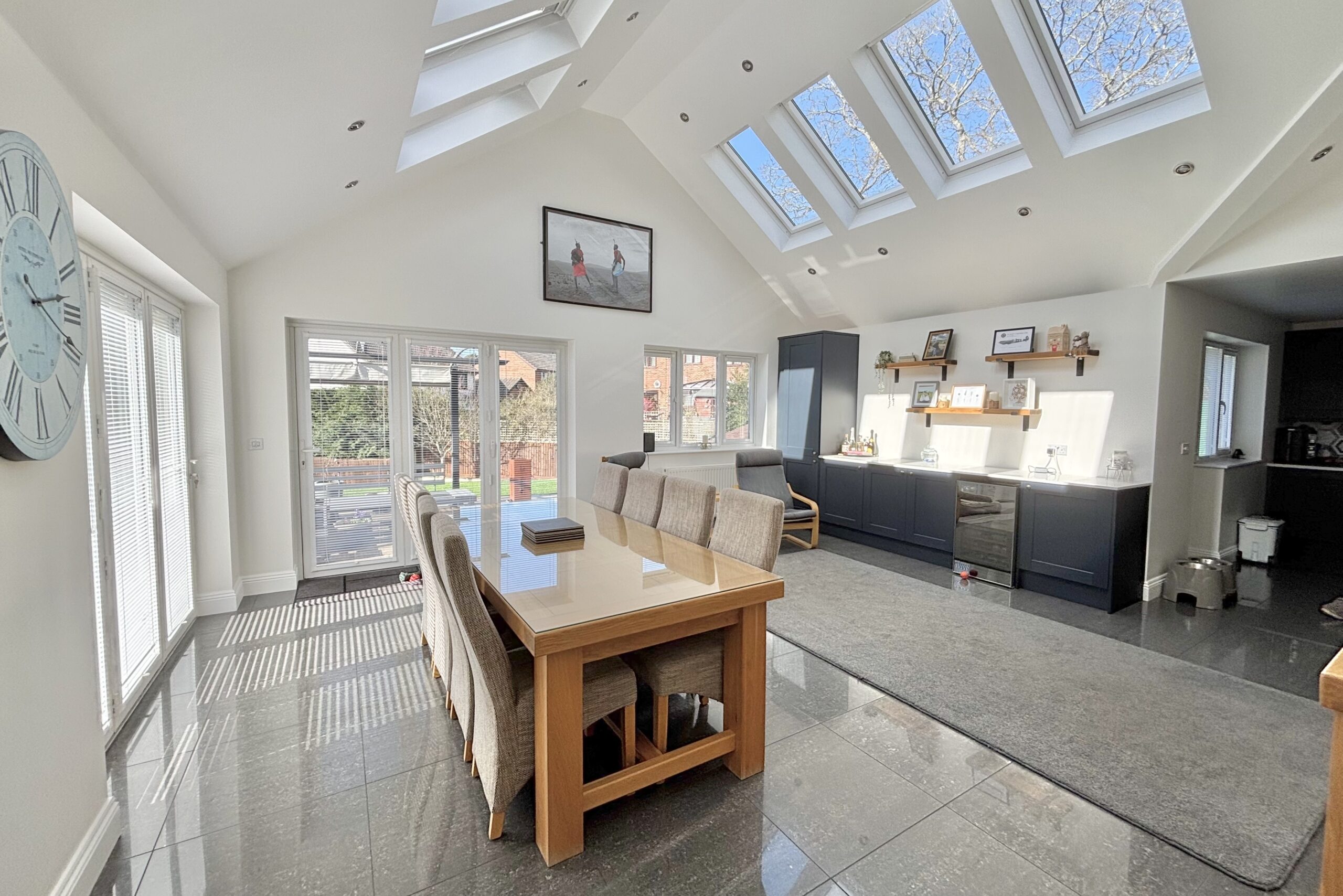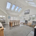 The property offers five/six generous double bedrooms, complemented by three dressing rooms and two well-appointed en suite shower rooms. The flexible accommodation allows the layout to adapt to a variety of needs, whether for larger families, guest accommodation or multi-generational living. As well as a relaxing lounge with log burner, there is also stunning family room to the rear featuring a vaulted ceiling that creates a wonderful sense of space and light. This inviting area provides the perfect setting for everyday family life as well as entertaining guests and leads through a stylish kitchen with island.